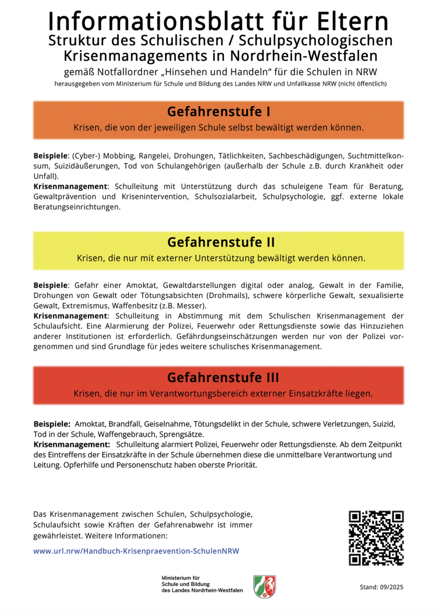 Auf der Rückseite dieses Schreibens finden Sie eine Übersicht, wie das Schulische Krisenmanagement in Nordrhein-Westfalen aufgestellt ist und schnell und professionell auf Krisen reagiert. Auch die Schule Ihres Kindes ist darauf vorbereitet und wird dabei durch die vielen genannten Unterstützungseinrichtungen begleitet.